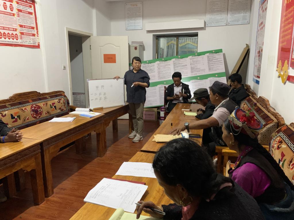 在学习培训中,驻村工作队根据村“两委”的语言基础,制定了培训方案,采取形式多样、内容丰富,通俗易懂的内容方式进行授课。一是针对基础薄弱的村干部采取“一对一”结对帮学,从会写自己的汉语名字、简单的词语、简单的日常用语等帮扶的教学方式进行;二是针对会说会写的村干部,结合《学说汉语》和《西藏自治区村(居)干部国家通用语言文字读本》等教材内容进行授课。