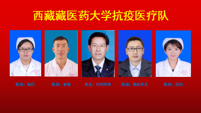 8月16日晚,学校党委接到上级部门命令,迅速响应,立即召开紧急会议,按照预定工作方案,紧急从我校附属医院主动请战的医护人员中挑选精兵强将,组成以副院长白玛罗布教授为组长,以医生德庆多吉、更桑和护士强白、次白为成员的五人抗疫医疗队。